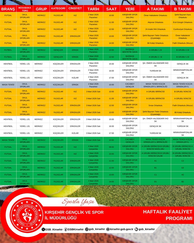 2026 tarihleri arası Haftalık Gençlik Faaliyetleri Programımız